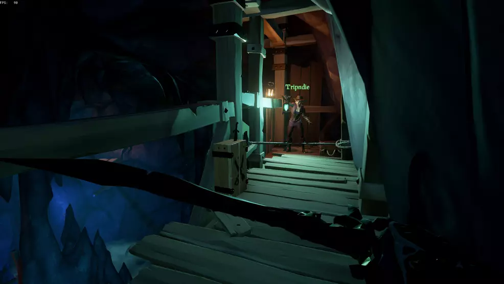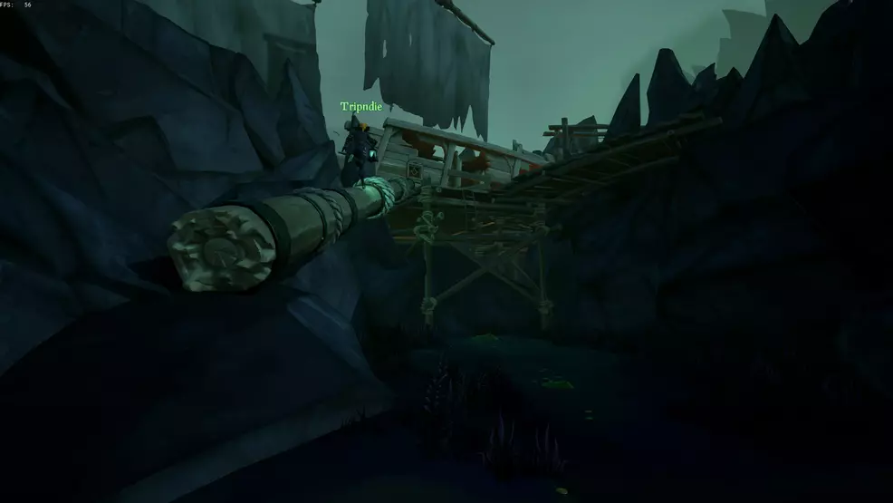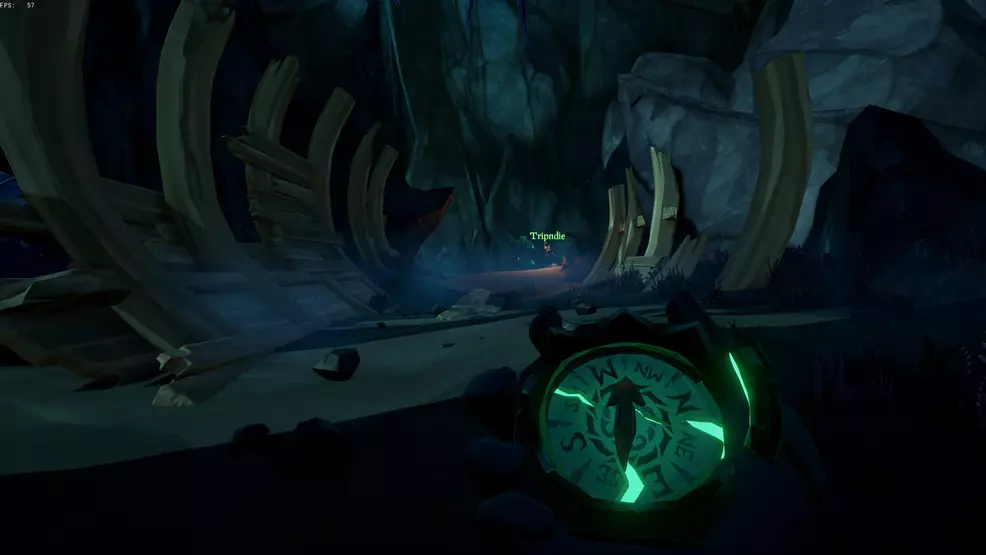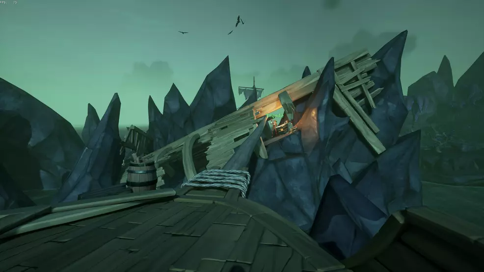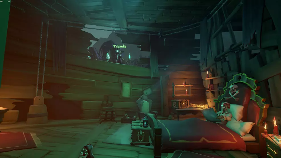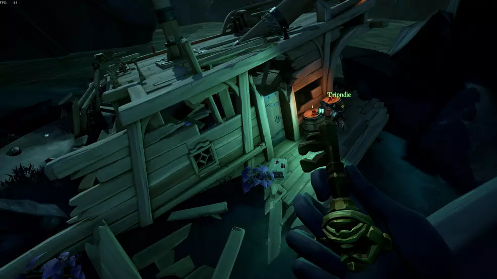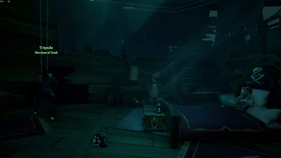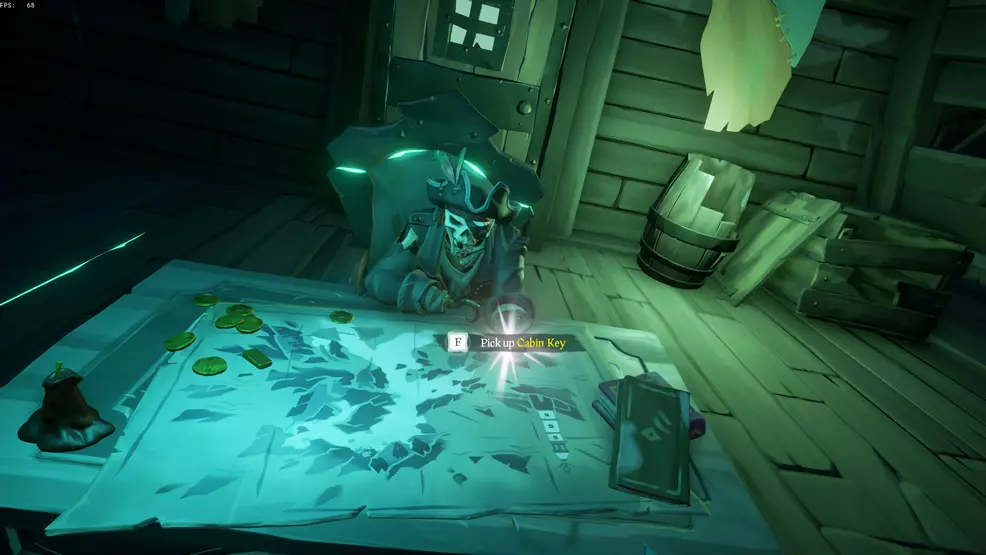 Next, you will need to notice Dougie'due south treasure, this begins with finding the treasure map. Caput dorsum toward the center of the area, where the Cursed Captain'south cage is located. On the side of the surface area will exist a boardwalk heading effectually the rocks to the front of the broken ship. Open the ship door and head inside to discover a skeleton in a bed.