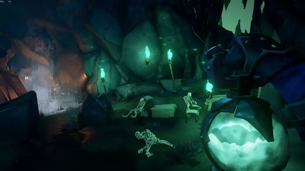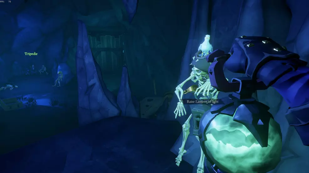 The next surface area volition have more than skeletons and three lanterns to light. The first is on the correct-hand side being held by a skeleton with a seagull on his head. The next is in the center of the room – you lot will need to move the skeleton's arm to get the lantern. The concluding is found by post-obit the flowing water to a wrecked rowboat. With the three lanterns lit, the gate will open.