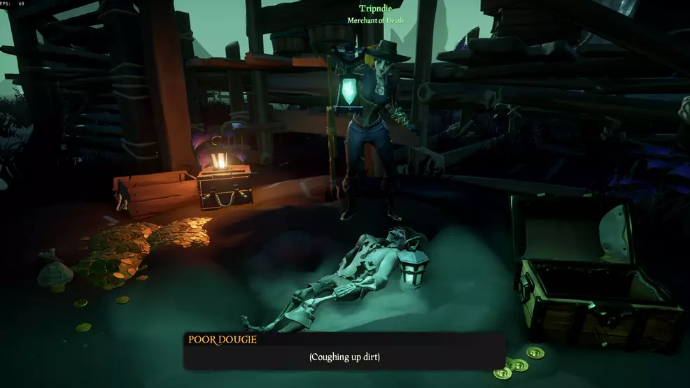 The coins will atomic number 82 you back down the rocks and toward a wreckage beside the tavern. In that location will be a hole in the ground, dig here to unearth Dougie. Lite his lantern to bring him to life.